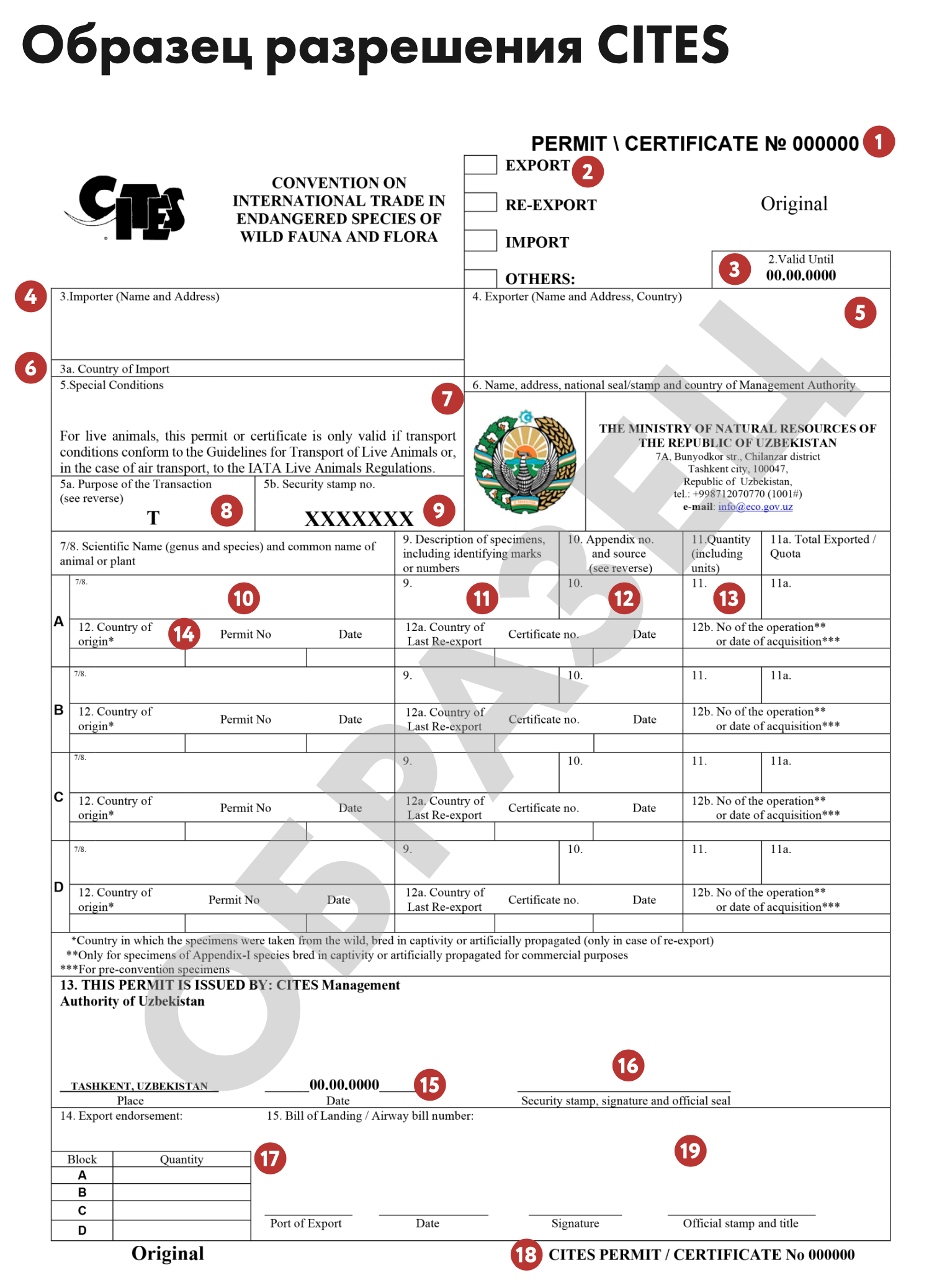 Блок 19 — на каждом экземпляре разрешения CITES дополнительно ставится тисненная печать, снабженная оттиском в виде эмблемы CITES.